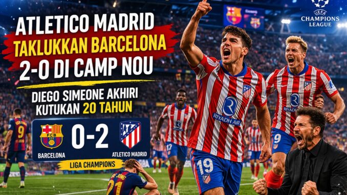 Kemenangan besar diraih Atletico Madrid saat bertandang ke markas Barcelona di Camp Nou. Dalam laga leg pertama perempat final Liga Champions, Los Rojiblancos sukses menaklukkan Blaugrana dengan skor 2-0, sekaligus mengakhiri penantian panjang selama hampir dua dekade tanpa kemenangan di stadion tersebut.