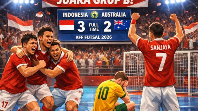 Hasil Timnas Indonesia vs Australia futsal di Piala AFF Futsal 2026 menjadi salah satu pertandingan paling menarik di fase grup. Indonesia berhasil meraih kemenangan 3-2 melalui laga penuh drama hingga menit terakhir.