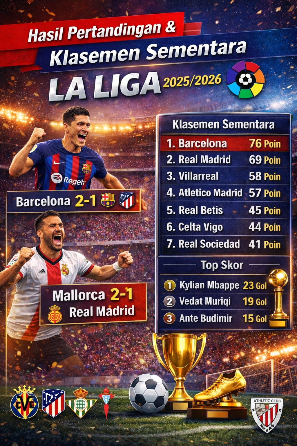 Berikut ulasan lengkap mengenai hasil pertandingan terbaru, klasemen sementara La Liga, serta analisis persaingan gelar juara musim ini.
