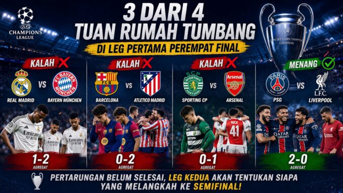 Pada babak perempat final Liga Champions musim ini, empat pertandingan berlangsung dengan hasil yang cukup mengejutkan. Dari empat laga tersebut, hanya satu tim tuan rumah yang mampu meraih kemenangan, sementara tiga lainnya harus menelan kekalahan di depan pendukungnya sendiri.