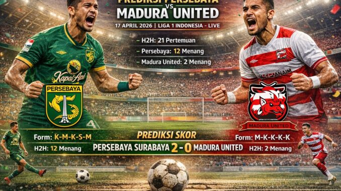 Pertandingan Persebaya vs Madura United pada 17 April 2026 diprediksi menjadi salah satu laga menarik dalam lanjutan Liga 1 Indonesia. Secara statistik dan performa, Persebaya lebih diunggulkan untuk memenangkan pertandingan ini.