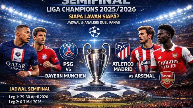 Babak semifinal Liga Champions 2025/2026 menghadirkan empat tim kuat dari empat liga berbeda: PSG, Bayern Munchen, Arsenal, dan Atletico Madrid. Dua pertandingan besar akan tersaji yaitu: